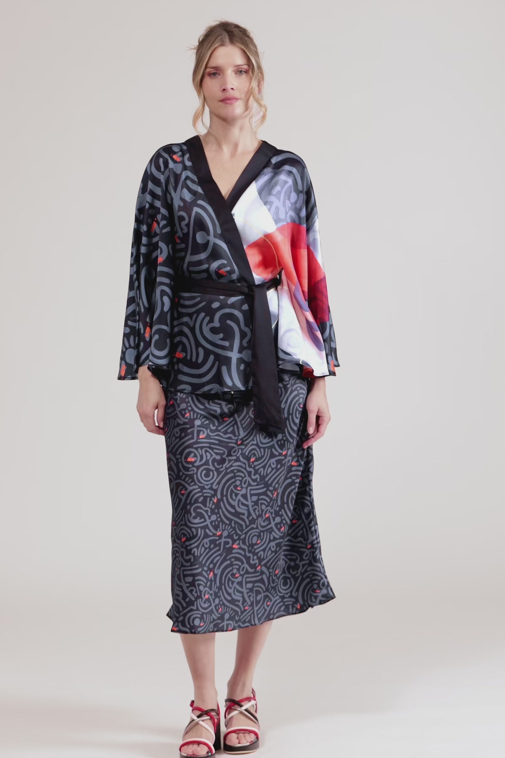 Dieser gemusterte Kimono von Anekke schwebt bei jedem Schritt: ultrafließender Stoff, umhüllender Fall und weite Ärmel, die die Luft streicheln. Die verstellbare Taille mit Bindegürtel ermöglicht es dir, die Silhouette je nach Anlass zu betonen oder zu lockern. Trage ihn offen als leichten Überwurf oder gekreuzt für einen eleganten Look. Mit einem schlichten Top und Jeans, über einem Midikleid oder zu High-Waist-Shorts.